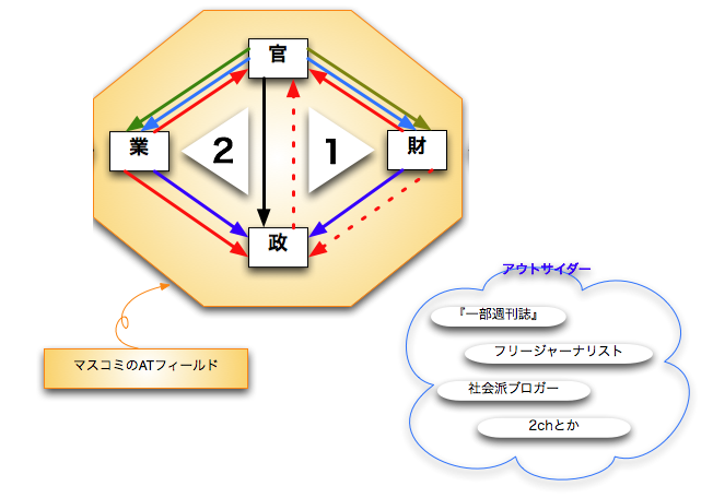 というわけで、神保さんの言う『「統治権力」というリヴァイアサン』、自分が「ダブル・トライアングル」と捉えているもの、すなわち「絶対領域の向こう側はナニカ?」の答えは、ATフィールドの展開ポイント、すなわち「記者クラブのあるところ」がヒントになる。