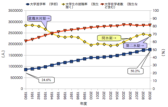 大卒の就職率は、1)1990-2000:バブル崩壊を受けて低下が始まり、2)2001-2005:小泉政権の期間中にハドメがかかり、3)阿部・福田・麻生政権中に反転するも、4)08Q4金融危機を経て第二氷期入り。なおオレンジの線は「大学在学者数(院生を含まない)」を見つけられなかったので、あんまし意味ない。院生を増やして経営規模を維持しているのかな。とは思う。