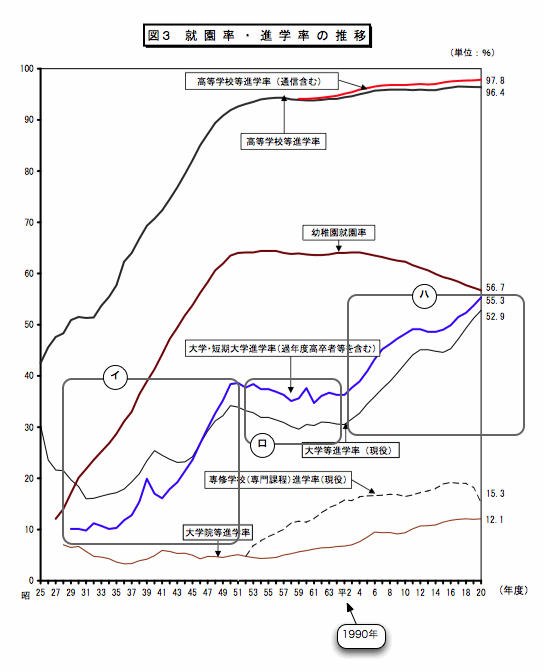 ハ)1990年(H2)頃から大学進学率が急伸。