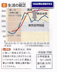 1927【青空文庫】『 ああ玉杯に花うけて 』佐藤紅緑 創作物(というより今で云う少年ジャンプ)だが、当時の「格差社会」の描写がある。より端的には↓ ![]() 【図】山川 詳説日本史図録(第2版)P252 1920以降は物価が下がっても賃金は下がってない。つまり差益が生じている。むしろ上がってさえいる。確かにWW1中は「生活の窮乏」といえるが、戦後は 「大正デモ暮らし」 という方が適当だろう。 この時期は、戦後不況といいつつ円本/岩波文庫、雑誌、レコード、ラジオ、映画、宝塚、三越、文化住宅(阪急など鉄道沿線の分譲住宅)と、勤め人(官吏軍人教員社員)はえらく羽振りが良さげだが、これが「昭和大衆文化」の原資と思われる。この時期には新聞の総部数も大飛躍を遂げている。 一方では 大卒就職率は約30% 、 解雇された労働者 は汽車賃もなく徒歩で帰郷するが、実家では娘の身売りの相談をしていましたよ、という感じ。 |